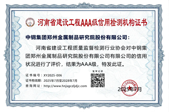 中鋼制品院榮獲2025年度河南省建設(shè)工程3A級(jí)信用檢測(cè)機(jī)構(gòu)證書(shū)